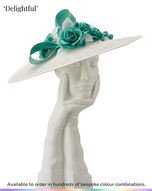 Every hat in this gallery can be recreated in colours to suit your outfit. I offer over 70 bespoke colours, and during your consultation, we can compare fabrics and hat materials under natural light to find the shades that work most beautifully with your dress, shoes, and accessories.